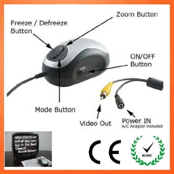 AV Low Vision Magnifier KLN-RA35 Constructions: The unit comes in two parts: Power supply and the Magnifying unit. The magnifier unit has a cable coming out of it with two ends. One end is the AV plug that plugs into the TV and the other end is the socket for the power supply. The magnifying unit has 4 buttons and an on and off switch. The magnifying button is a rocker switch that can either increase or decrease the size of text or image on the screen Buttons on the magnifying unit: Mode button: Has 3 different settings, color, negative and positive. Color - Color images Negative - This makes text appear white with a black background. Positive - This makes text appear black with a white background. Freeze: Freeze and D-freeze current image Wheels: The unit has 4 roller wheels to help guide the unit from left to right in a straight line. This is quite a useful feature and is not common to other similar products. Power switch: On the side of the magnifying unit is the on and off switch. The switch moves backwards and forwards. ![]() Product Benefits: • Inexpensive for this type of video magnifier • Freeze frame • variable magnification (20 - 70x on a 20 inch monitor) • variable viewing modes Points to Consider: • The starting magnification level is quite large and may be too large for a number of people. • If you are a quick reader, In both positive and negative modes, the text would distort. This is a common problem with units like this. Slower readers would not see this as much. • On and off switch for the magnifying unit is very firm. • As with all units that are placed directly on top of the reading material, The lights on the units cause problems with shiny surfaces such as magazines and coloured brochures. . Helpful Hints: Some people find it easier to guide these types of magnifiers by placing their entire hand over the unit rather than holding it with a few fingers. Packing Information: Size of Unit box:: 21cm*16cm*9cm Gross Weight:510g Size of One Carton:46*50*52CM, Gorss Weitgh: 16kg. 30 units/one carton |